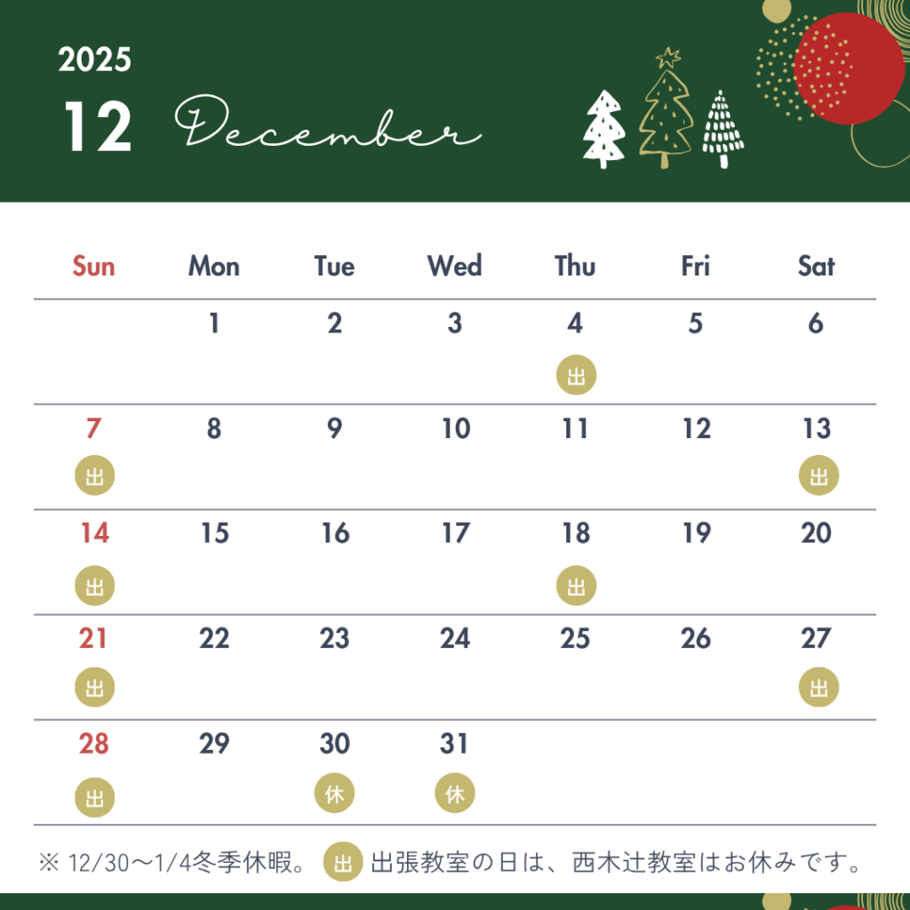投稿日: 2025年11月23日 投稿者: goodtable12月の予定 営業時間 9:00〜20:00ご予約 090-7753-3954お電話・ショートメールまたはお問合わせフォームよりご希望の日時をお知らせください。 出張教室の日は、西木辻教室はお休みです