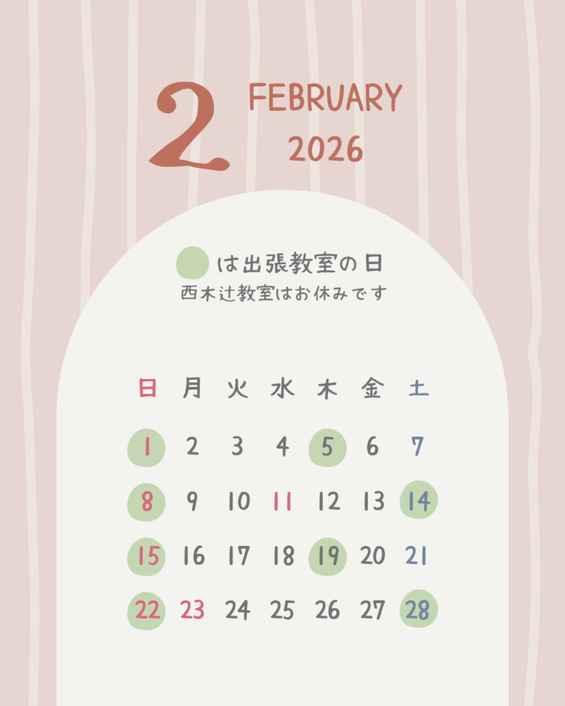 投稿日: 2026年1月25日2026年2月9日2月の予定 営業時間 9:00〜20:00ご予約 090-7753-3954お電話・ショートメールまたはお問合わせフォームよりご希望の日時をお知らせください。 出張教室の日は、西木辻教室はお休みです